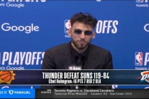 体育资讯4月20日讯 在今天结束的一场季后赛中,雷霆以119-84战胜太阳。赛后,雷霆球员切特·霍姆格伦出席了新闻发布会。以下是完整版采访内容。