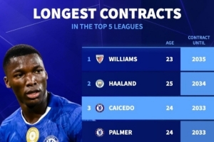 体育资讯4月17日讯 切尔西已经官宣同凯塞多续约至2033年,《转会市场》统计显示他也并列当前合同最长球员第三位。
